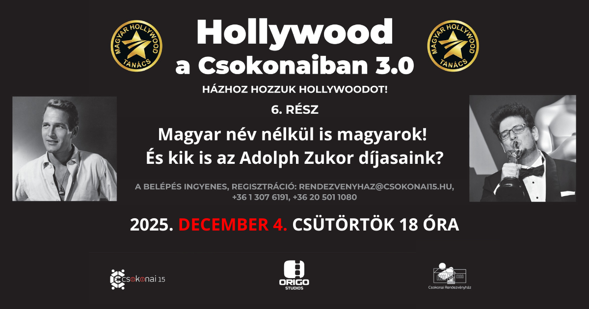 Az est előadója Bokor Balázs, a Magyar Hollywood Tanács elnöke, aki vetítőképes prezentációban mutatja be, kik azok a magyar származású alkotók, akik név nélkül is maradandót alkottak Hollywoodban, és kik kapták meg az Adolph Zukor-díjat – a filmvilág egyik legnagyobb alakjáról, a Paramount Pictures alapítójáról elnevezett elismerést.